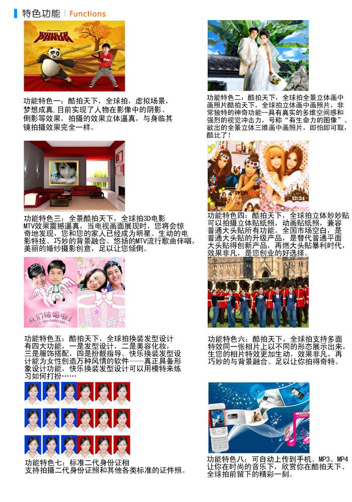 ◆一店多能,業(yè)務(wù)多元,錢途多多:有婚紗攝影、兒童攝影、證件照、藝術(shù)寫真等。傳統(tǒng)影樓能做的,全球拍都能做到。而且具有不需要布景,不用外景地,占地面積小等優(yōu)點。另外還有時尚大頭貼、趣味娛樂等功能。拍出來的照片可以現(xiàn)場刻盤、現(xiàn)場取相、放大或制作水晶相、陶瓷相、電子相冊、動態(tài)立體畫中畫、印制個性T恤等。